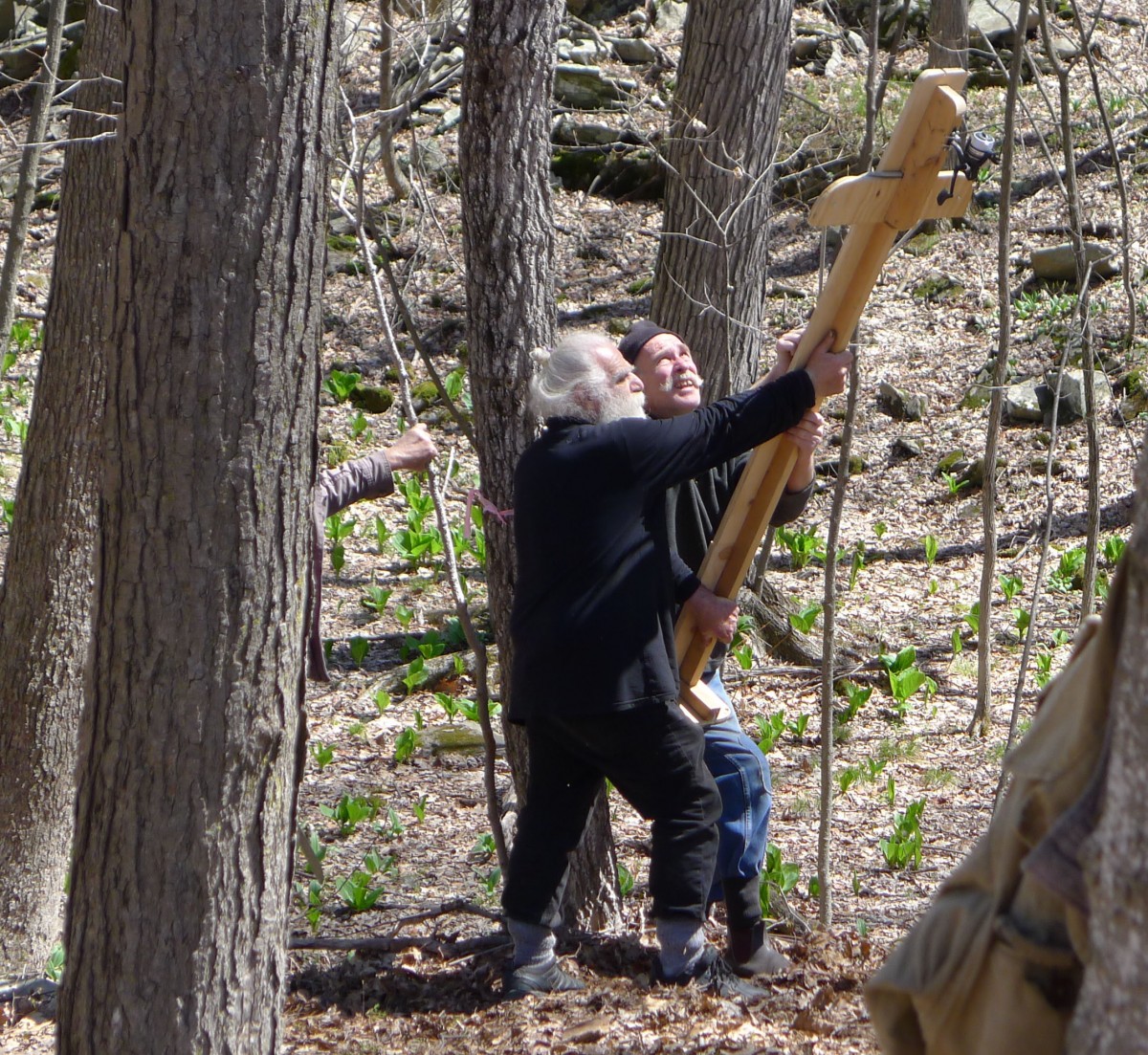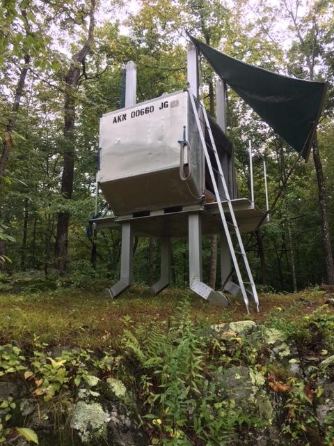 Taking both of us to slingshot the weighted ‘Messenger line’ through the ‘Crotch’ of the trees to hang the Skypod treehouse 2017.